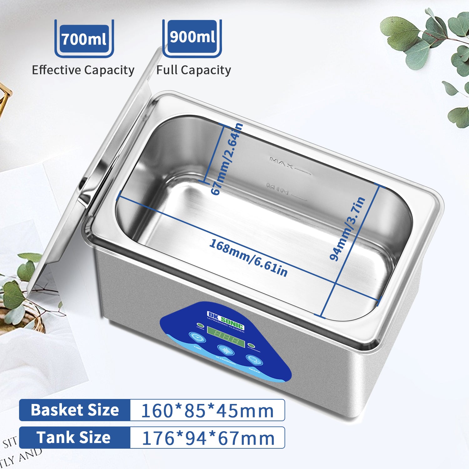 The ultrasonic cleaning machine features two smart buttons on its panel: one for intelligent timing and the other for degasification. With 5 preset modes, you can set the cleaning duration from 180 seconds to 900 seconds.